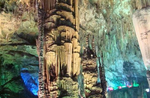 龙宫景区先会看到黄绿两色水稻龙字,再去看塘水终年顺时针转的漩塘,真的是感慨大自然的神奇,翻山钻旱洞后就要乘上小船进龙宫水洞了,划过不知多深的水面,洞口挺大,岩石峥嵘,犹如进入虎口有些恐惧,洞内钟乳石参差不齐,形状各异,洞厅的规模也大小不一,最宽处五六十米高七八十米,真是宏伟壮观,有时又要低头侧身让小船在岩缝中穿行,加上五彩灯的点缀更添神秘幻彩,里面的中国最大洞中瀑布让人震撼颤抖...我就边看边心里喃喃自语:喀斯特啊,喀斯特,贪婪的眼神都有点看不过来...