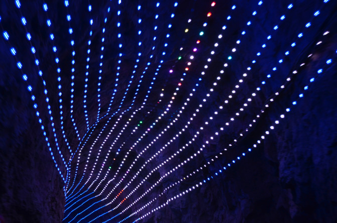 峋,奇峰罗列。有的错落成桥,有的兀立如柱,有的侧身探海,有的悬挂洞顶......彩灯虽摆放得杂