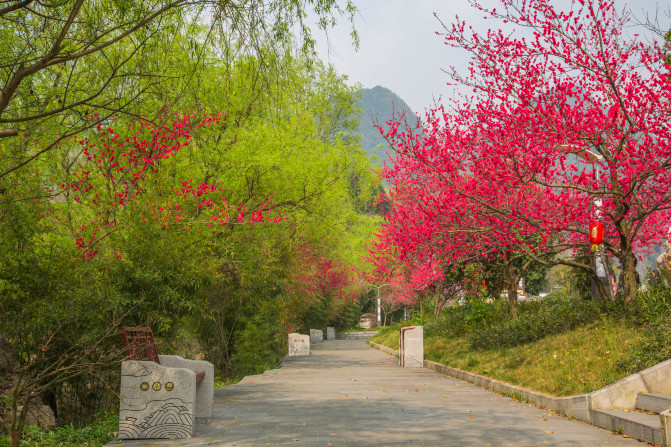 由漩塘坐游览车到桃子村,处处种着桃花,空气清新,有石桥,有溪水,有凉亭,有错落的房舍,