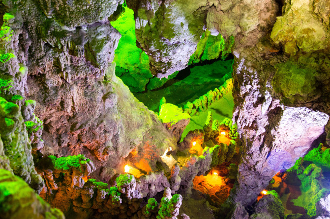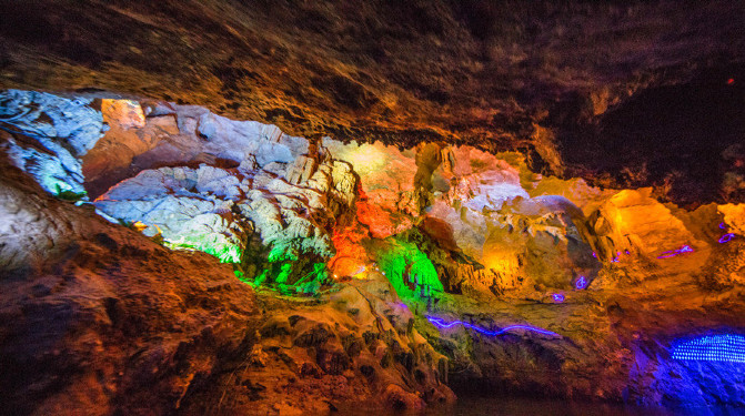 经过千万年形成的石幔、石花组成的多式多样的图案。岩壁两侧,隧道顶部用彩色的灯装饰而成,