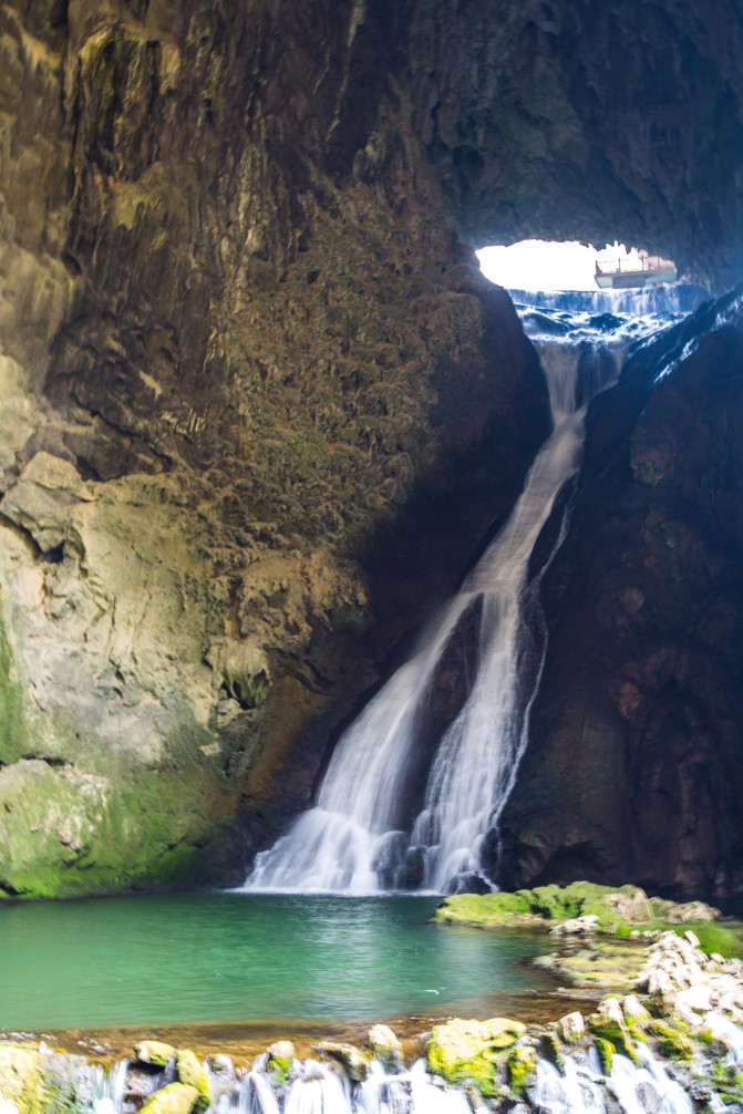 口喷出,形成了一个天然的瀑布,虽不及黄果树瀑布的壮观,但也有其自身的特色,导游姐姐介绍