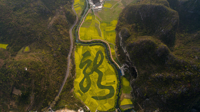 刚进景区坐着大巴直奔游客中心,从窗子看到外面一大片油菜花田,仔细一看竟是一个“龙”字,不禁